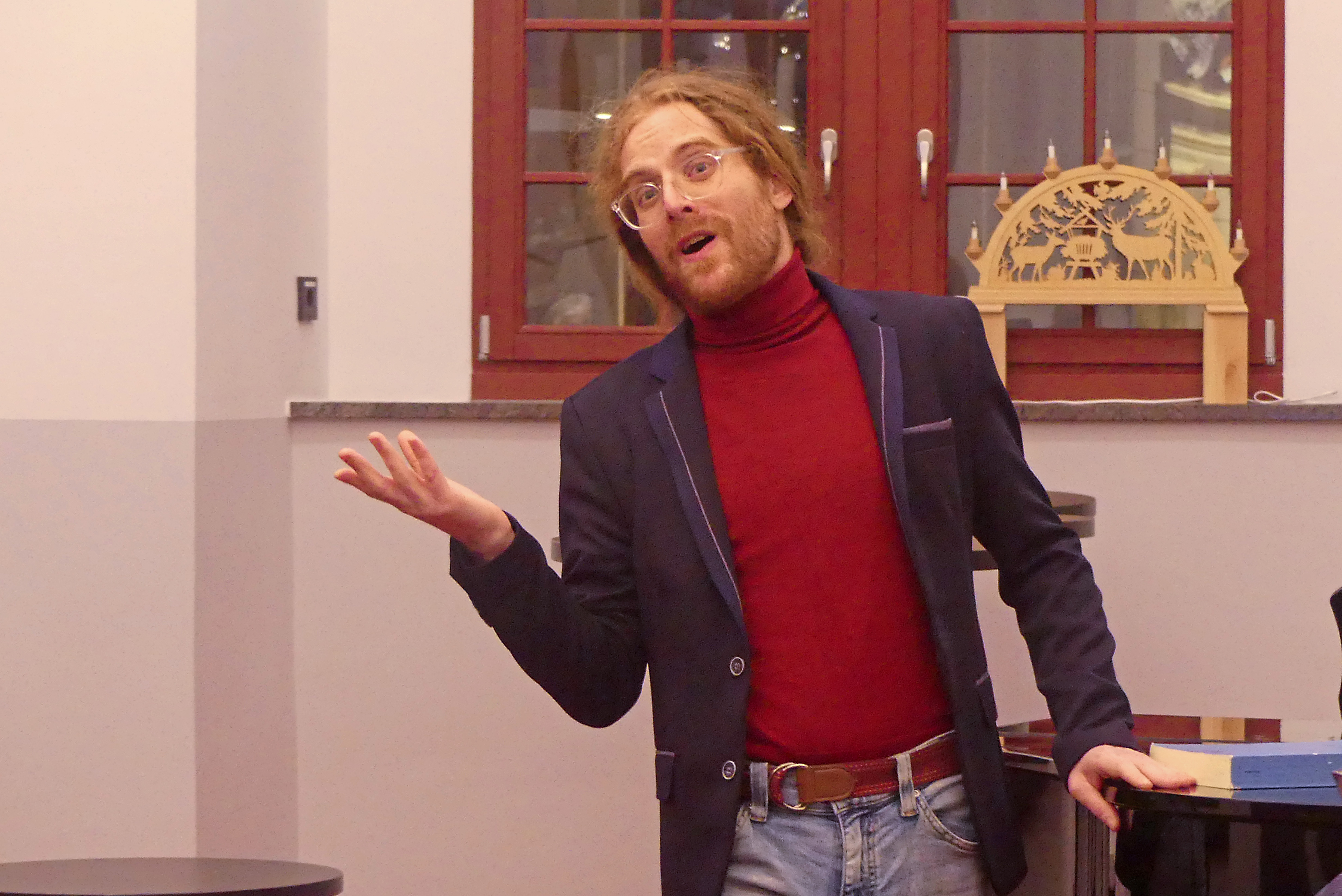 Der Gast unseres Februar-Stammtisches, der amerikanische Bariton Gabriel Wernick, hat bereits zur letzten Jahreshauptversammlung unser Herz erobert und begrüßte uns mit einem Lied von Brahms. Danach hörten wir noch die Registerarie aus „Don Giovanni“. Begleitet wurde er, wie schon traditionell, von Mattias Spindler am Klavier.